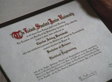 When Chuck gets home, Ellie greets him excitedly and gives him a Stanford diploma which had arrived in the mail. Sarah had told her that Chuck had been working online to complete his degree. He graduated in electrical engineering, his final 12 credits based on his "practical studies." working with the CIA. He thanks Sarah for the fake diploma, but she tells him it is real, earned with all of his field work, and Stanford agreed.