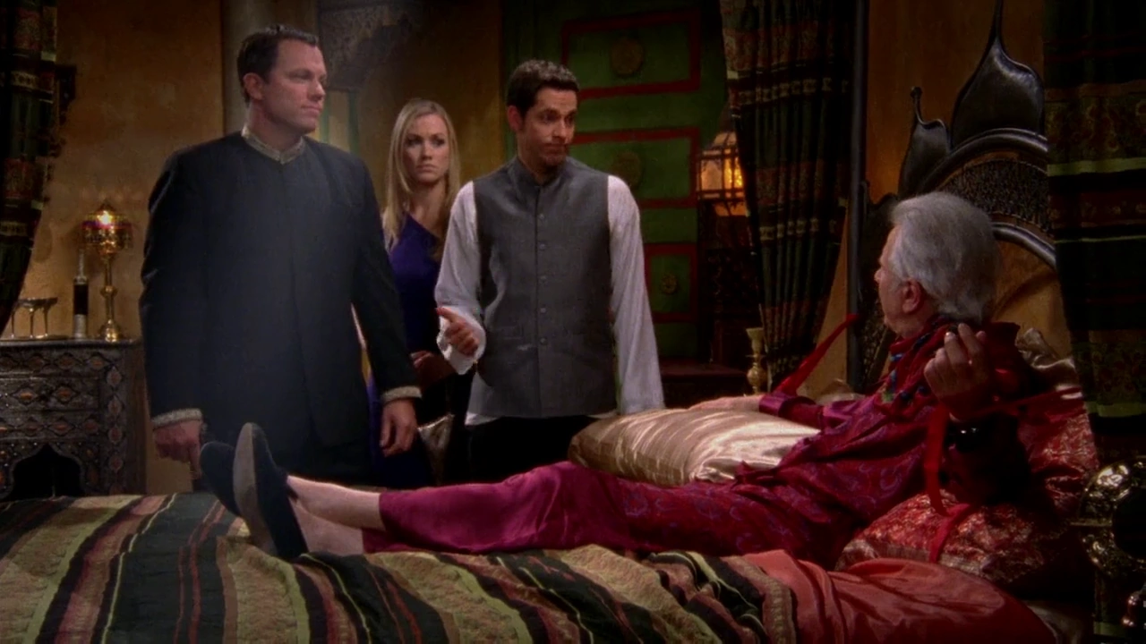 After arriving in Morocco, Chuck, Sarah, and Casey enter the palace to find Fatima. Sarah, while watching the belly dancers, states flatly that she would not be wearing such an outfit at any point on the mission. The team then make their way through and find Roan tied up to a bed, blindfolded. Roan, hearing their footsteps believes them to be Fatima's guards, as he asks them if they had brought the oil. He then assumes the footsteps were of two women, and a large man. An exasperated Chuck takes off Roan's blindfold and responds that he meant two large men. They attempt to rescue Roan, but he refuses their efforts as he is about to "seal the deal" as head of distributor for Fatima in an attempt to get close to her counterfeiting partners. Chuck and Sarah hide behind a curtain while Casey is under the bed as Fatima enters the room. Roan and Fatima continue their flirtation as Chuck tries his best not to sneeze. He sneezes anyway, and he and Sarah are compromised, as well as Roan's mission.